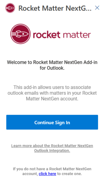 If you are not already logged in to Rocket Matter from Outlook, you will be prompted to sign in.