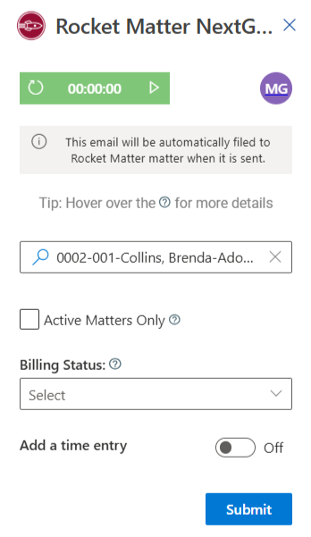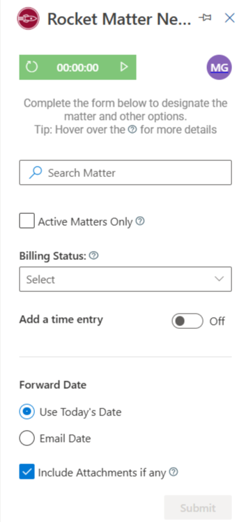The Outlook Add-in allows you to add an Outlook email that you receive, send, or draft to a matter and track time. If you have not already, learn how to Install the Outlook Add-In.